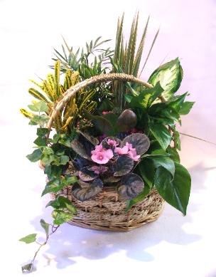 This European design features several easy to care for plants in a beautiful wicker basket.