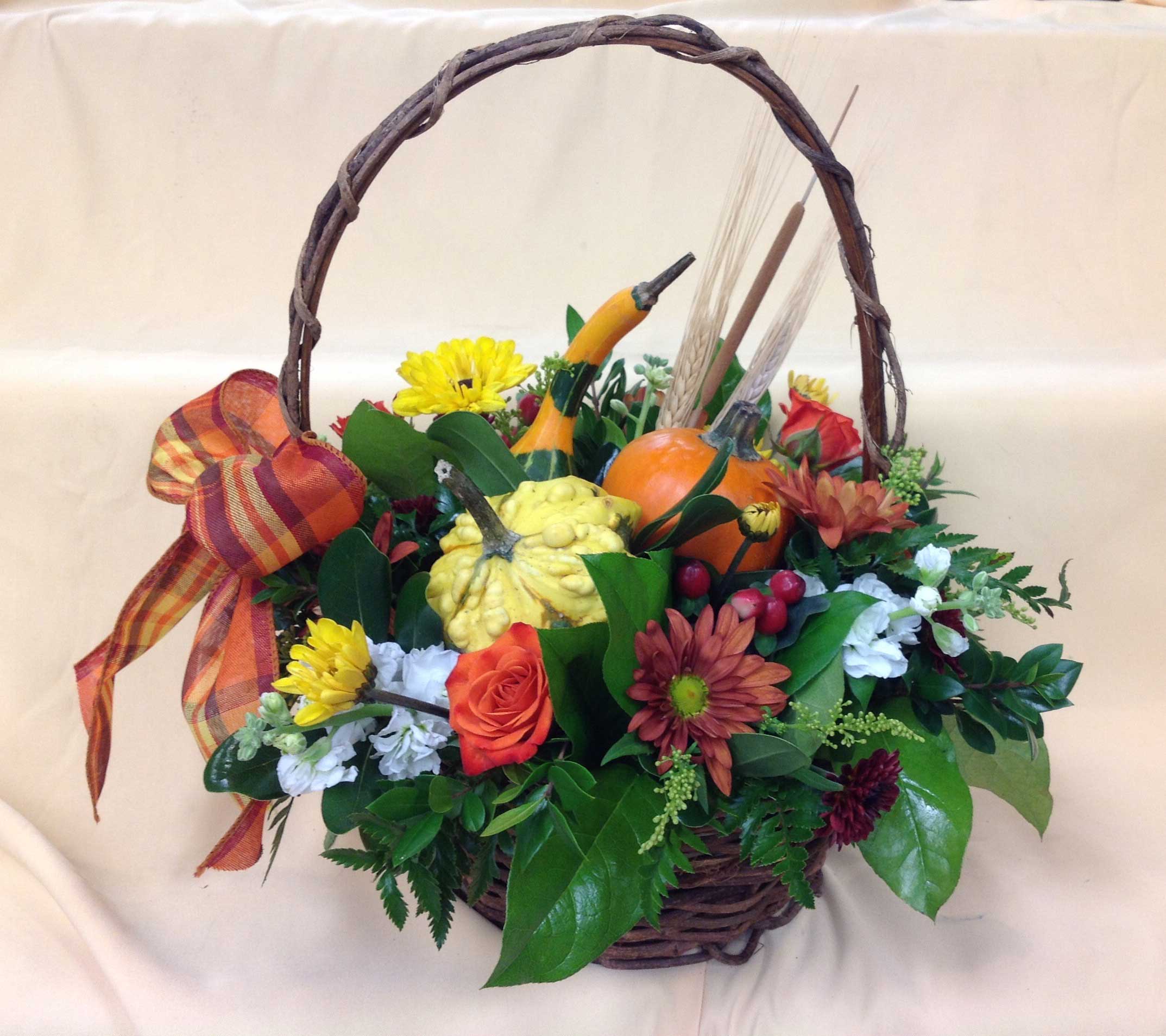 An assortment of fall gourds, flowers, and greens in a basket.