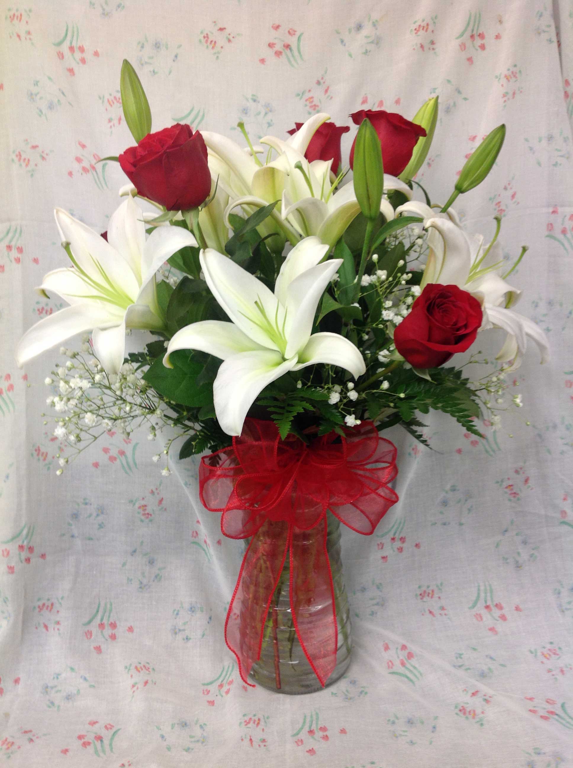 Send your Valentine a special arrangement of roses and white Oriental lilies.